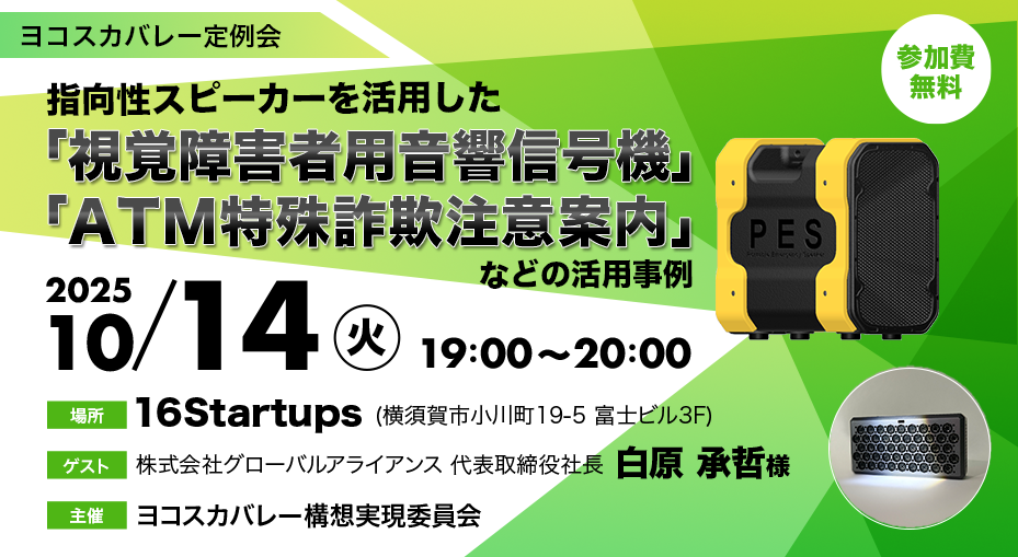 ヨコスカバレー定例会(第60回)開催のお知らせ 投稿: 2025年10月1日 汐入のソフトウェア開発会社、株式会社AF… ヨコスカバレー定例会(第59回)開催のお知らせ 投稿: 2025年7月28日 ヨコスカバレー定例会として、株式会社Re… ヨコスカバレー定例会(第58回)開催のお知らせ 投稿: 2025年6月13日 ヨコスカバレー定例会として、ニフコ×タイ… “YOKOS会議2022”開催! 投稿: 2022年11月18日 活動8年目を迎えているヨコスカバレー構想… 小学生向けDSプログラミング講座/中学生・高校生向けiPhoneアプリプログラミング教室講座 投稿: 2022年10月4日 ヨコスカバレー(プログラミング研修ユニッ… YOKOS会議2021 YouTube公開! 投稿: 2022年2月21日 YoutubeにYOKOS会議2021の… “YOKOS会議2021”開催! 投稿: 2021年11月30日 活動7年目を迎えているヨコスカバレー構想… 【2021年度定例会開催予定】 投稿: 2021年4月12日 ヨコスカバレー構想実現委員会は偶数月第… YOKOS会議2020 YouTube公開! 投稿: 2021年1月12日 YoutubeにYOKOS会議2020の… “YOKOS会議2020”開催!〜eスポーツと観光でヨコスカから世界へ〜 投稿: 2020年12月7日 ICT・IoTで「10年、100社、10…